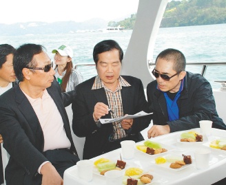 郭臺銘與李朝卿昨天并陪著張藝謀搭船游湖。為了讓張藝謀能坐在視野最好的船弦邊座位,郭臺銘還親自將靠船弦的桌上餐盤移到另一桌,笑著招呼張藝謀就座。