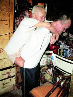 中新網6月15日電 據臺灣媒體報道,經濟不景氣讓臺灣社會角落困苦無依的邊緣人有增無減。苗栗市文山里84歲里民蔡阿樟,今年初雙腳罹患烏腳病被迫截肢,兒子蔡錦云20多年前,工作時不慎觸及高壓電失去雙手,父子兩人“共享”雙手、雙腳相依為命,處境堪憐。