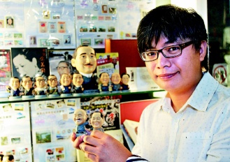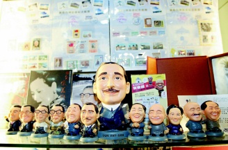 什么商品最受陸客歡迎?吳松洲指著玻璃柜里一排“政壇明星公仔”,包括抱黑貓白貓的鄧小平、手拿十大建設(shè)藍(lán)圖的小蔣,還有馬英九、蕭萬長等,笑說這是店里的“招財(cái)貓”,許多陸客一買就是二十幾個。