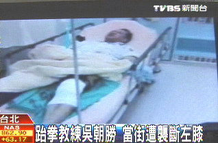 中新網7月16日電 據臺灣TVBS 報道,島內跆拳道界相當知名的教練吳朝勝,15日晚間從道館下課后突然被2名歹徒持棍棒攻擊,當場倒地不起,民眾報警送醫,據了解傷勢嚴重,左膝粉碎性骨折,一直到凌晨都還在手術。