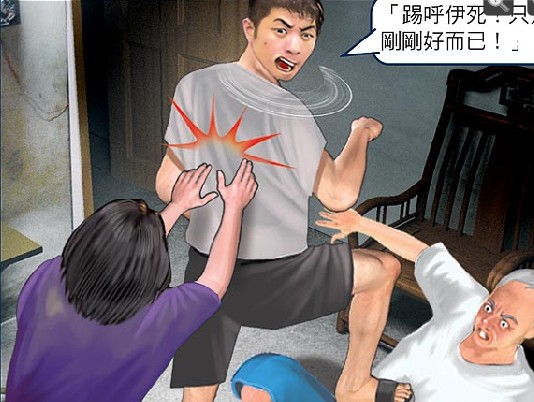 沈父倒在地上不斷哀號,在房內睡覺的沈弘隆姑姑趕緊跑出來察看,大喊:“不要打了!”一把將侄子推開說:“當兒子的,怎么可以打老爸!钡蚝肼∈ダ硇,還回嗆姑姑說:“踢呼伊死(指沈父)!只是剛剛好而已!”甚至拉開姑姑,再踢了父親一腳,才掉頭逃離現場。