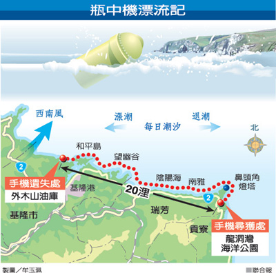 這只“瓶中機(jī)”由基隆“流浪”到貢寮,中間穿過(guò)基隆港、望海巷、陰陽(yáng)海、水湳洞等地,最后從鼻頭角漂進(jìn)龍洞灣海洋公園;流浪了三天多,漂流距離約20浬(34公里)。