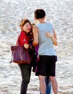 接獲惡耗的家屬相繼趕到后湖海灘,有人癱倒在親人懷抱中,不停哭喊愛子的名字,要他們趕快回來,有的則手持念珠面向大海,盼望出現奇跡,天下父母心的焦灼憂慮,讓蜂擁關切的民眾看了也心酸。