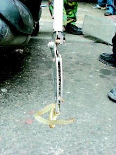 一起停等的騎士看了都嚇了一跳,要王婦把車(chē)推到武陵派出所,請(qǐng)警員幫忙抓蛇;她直奔派出所,但警員不諳抓蛇,再請(qǐng)來(lái)消防隊(duì)員幫忙。
