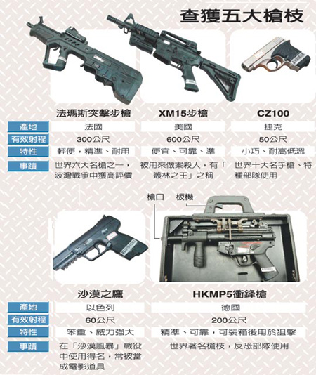 不乏島內首見的槍型中,例如手提箱式MP5沖鋒槍,可從手提握把直接扣扳機,外觀與一般手提箱無異,使用者提著它走進人群,就算是“總統級”的維安也防不勝防,故有人稱它“要命的手提箱”,黑市價格應在百萬元以上,警方認為訂貨者動機可疑,準備用它來刺殺誰,有查明必要;另有9把以色列突擊步槍,浸泡海水后可立即使用,也是首次查獲。