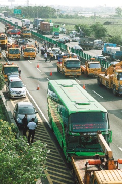 上午十一時五十二分塞車仍嚴重,這時,由蘇谷邦(五十一歲)駕駛的客運,從臺南載十名乘客到臺中,過了員林交流道,在中線車道行駛,眼見前方車陣竟未煞車沖去,先撞上一輛運鈔車,接著從內側及中側車道一路狂閃,追撞十三輛車后,停在外側車道。