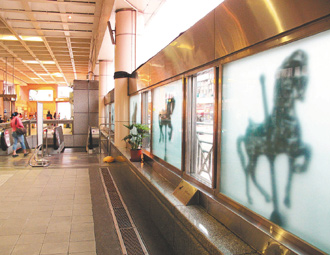 還有府中站“空間之詩”,造型特殊的長條型LED字幕機,民眾可用簡訊上傳詩文發表,但似乎使用率也不高,古亭站“邂逅”,造價近500萬元,12件臉譜創作,因高度過高、不易清理,已經看得出“歲月”留下的痕跡,中正紀念堂往金華街通道“非想、想飛”,造價320萬元,原有的攝影作品已不復見,只剩黑漆漆的長條框框。