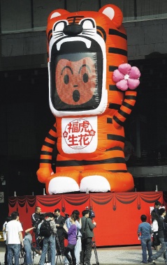 即日起,民眾經過市府前,將會看到2只可愛又招福氣的“開心福虎”。一只趴在市府大門樓上,一只在市府大門口,手上都拿著花朵,造型相當卡哇伊,宛如守護神般陪伴民眾度過虎虎生威的新年。福虎設計者李明道表示,市府大門口的開心福虎高9.5公尺、底座寬6.3公尺,手拿美麗花朵意味今年底“花博會”將在臺北登場,開心福虎的臉部裝有LED熒幕。