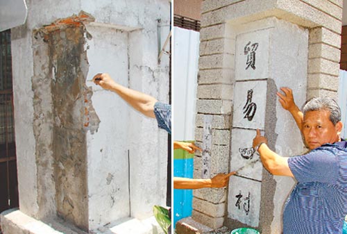 中新網5月20日電 據臺灣《聯合報》報道,臺南縣仁德鄉二空眷村將拆除改建大樓,包商日前把村門口由宋美齡落款題字“貿易四村”的石柱拆除,遭眷戶抗議并報警,指軍方與包商竊盜眷村文物。包商昨天把落款貼回,但損裂痕清楚可見。