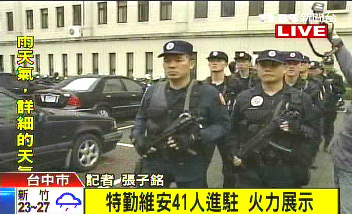 中新網6月2日電 據臺灣TVBS電視臺報道,臺中市接連發生重大刑案,維安特勤小組今日下午再次進駐臺中市,每名特勤隊員都配備了精良的武器裝備。不過警方表示,這次維安特勤人員進駐,穩定力量將多過于實質破案的績效。