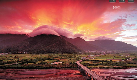 宜蘭南澳小學老師蔡沛旻昨清晨5時許,拍到南澳山區滿山火云,染成血紅的山頭向蒼穹激射出萬道紅光,仿佛火山爆發漫山熊熊烈火、又似盤古開天的氣勢,加上云彩翻山越嶺,氣勢壯麗磅礡,美妙的天象只維持5分鐘,已讓人驚嘆不已。