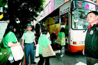 郝龍斌上午巡視加開的免費接駁學生公交車,臺北市規劃,今天上、下學時間每3分鐘一班,接送教育大學、教大附小、弘道中學學生上下學,清晨第1個班次大約在6點35分發車。