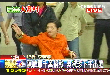 中新網(wǎng)6月15日電 據(jù)臺(tái)灣TVBS報(bào)道,陳水扁夫人吳淑珍15日下午再次到臺(tái)北地方法院開(kāi)庭,針對(duì)前臺(tái)北101董事長(zhǎng)陳敏熏的千萬(wàn)捐款,法官傳喚前陳水扁辦公室主任馬永成,還有臺(tái)當(dāng)局前“財(cái)政部長(zhǎng)”林全到庭說(shuō)明。