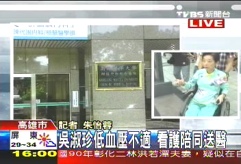 根據醫護人員初步檢查,吳淑珍疑似因為過度勞累而出現血壓過低的情況,住進醫院VIP病房,將接受主治醫生進一步的詳細檢查。
