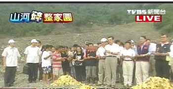 而馬英九到了遭土石掩埋的新開部落,也在當地焚香祭拜亡者,神情凝重;在進入新開部落前,會經過日前災民立牌寫著“32人死亡,SOS”的新寶橋,因為橋斷了,施工單位先在河床鋪上便道,讓車子可以通過。