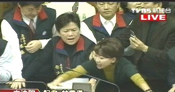 民進(jìn)黨“立委”趁機(jī)沖上主席臺(tái),企圖阻撓“立法院長(zhǎng)”王金平進(jìn)行表決程序,而藍(lán)營(yíng)“立委”也不甘勢(shì)弱圍堵,雙方便在主席臺(tái)上僵持。