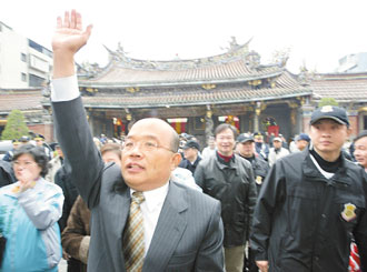 中新網(wǎng)3月3日電 據(jù)臺(tái)灣《聯(lián)合報(bào)》報(bào)道,民進(jìn)黨戰(zhàn)將蘇貞昌昨天(二日)到民進(jìn)黨中央當(dāng)面向黨主席蔡英文表達(dá)參選臺(tái)北市長(zhǎng)意愿,蘇貞昌今天上午十一時(shí)將在臺(tái)北市保安宮正式宣布參選,為民進(jìn)黨“雙城大戰(zhàn)”開(kāi)出第一槍?zhuān)_(tái)北市將上演“郝、蘇對(duì)決”。