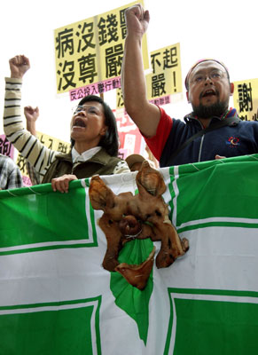 抗議者還利用豬頭道具,反諷民進黨參選人謝長廷日前有關“人不能只重視吃飯問題,否則就像只會吃和睡的豬狗等畜牲”的言論,質疑謝長廷,“難道不食人間煙火?”