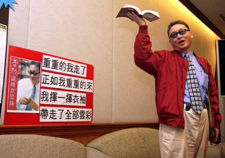 自稱以后要恢復作家李敖的身份,一身招套紅外套、一樣的墨鏡。李敖來去都一樣充戲劇張力。李敖說:“重重的我走了,正如我重重的來,我揮一揮衣袖,帶走了全部云彩!”