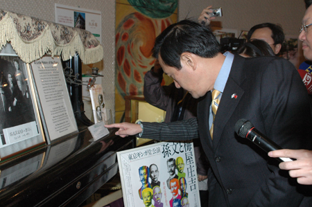 在下午忙碌的活動(dòng)中,馬英九也抽空前往位于日比谷公園內(nèi)的松元樓,參觀與當(dāng)年孫中山先生流亡日本時(shí)有關(guān)的史跡。松元樓現(xiàn)任社長夫人的祖父梅屋莊吉早年曾對(duì)流亡中的孫中山提供很多的協(xié)助,孫中山是一九一五年在梅屋的家與宋慶齡舉行婚禮的。松元樓的負(fù)責(zé)人親自為馬英九說明過去的這段歷史。