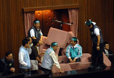 據臺灣TVBS報道,“中選會組織法”今天再度開戰,上次會議中綠營用大鎖將王金平鎖住,不讓會議順利進行,今天藍營先一步將門把拆掉,不讓事件重演,但綠營還是出招,出動“議會”里的椅子整個堵住大門,不讓王金平進入會場,整個議事再度呈現停擺。
