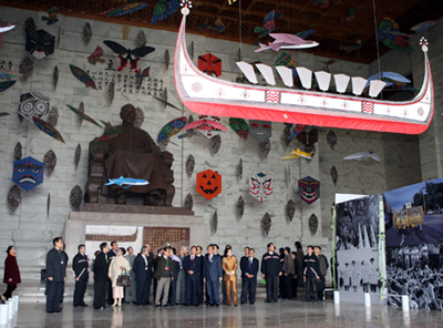 據(jù)臺(tái)灣中廣新聞報(bào)道,進(jìn)入主建筑物的二樓銅像大廳可以看到,蔣介石銅像仍維持原貌,但整個(gè)大廳裝飾了巨幅海報(bào)與歷史政治運(yùn)動(dòng)照片等,還垂掛風(fēng)箏以及“原住民“達(dá)悟魚(yú)舟紙做模型。