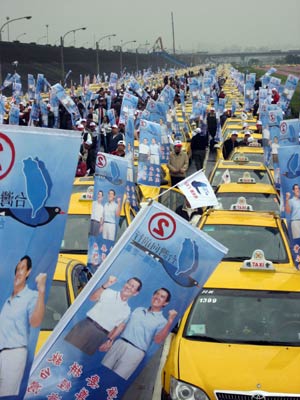 中新網3月10日電 向來被視為挺綠勢力的臺灣“全民出租車聯誼會”決定棄綠轉藍,在總會長邱奕枝號召下,上午陸續聚集兩千五百輛出租車并成立馬蕭后援會,場面壯觀。