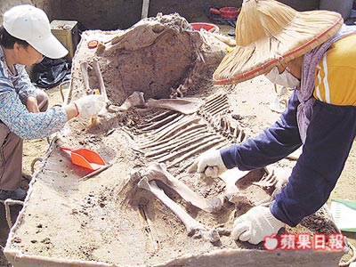 考古隊員表示,出土的馬匹遺骸,是一只側躺狀的全馬骨骸,鼻子附近有金屬扣環,背有類似馬鞍的褐色粉狀物,肚子還有類植物性粉狀物,應是馬當時肚子里的食物。