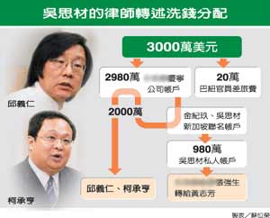 律師轉(zhuǎn)述,吳思材從當(dāng)事國回臺后告訴金紀(jì)玖,當(dāng)事國方面是要求兩千萬美元,金紀(jì)玖后來跟吳思材說,“老板(邱義仁)要你(吳思材)向黃志芳表示‘建交’要四千萬美元”,但黃志芳后來殺價成三千萬美元。