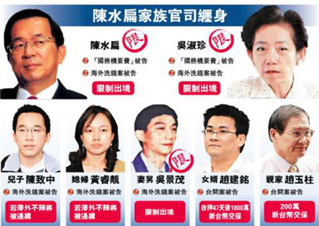 陳由豪對陳水扁“黑金疑云”開出關鍵第一槍之后,引發多米諾骨牌效應,接下來的四年,每次陳家曝光新的貪腐丑聞,臺灣老百姓都被嚇得目瞪口呆。陳水扁2004年連任后實行財產信托,申報財產從1994年任臺北市長前的1000萬元,飆漲到2003年底的7000萬元,股票市值從最初的55萬增至3億多元;2004年,媒體爆出吳淑珍收受SOGO百貨總值880萬元購物禮券,介入SOGO經營權爭奪戰;2006年5月,陳水扁的女婿趙建銘被指控涉嫌臺開股票內線交易;2006年6月,吳淑珍卷入“國務機要費案”。