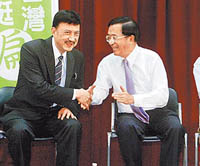 陳水扁與余天(左)會(huì)面。(圖:臺(tái)灣《蘋果日?qǐng)?bào)》)