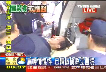 由于板橋醫(yī)院急診室沒(méi)有如亞?wèn)|醫(yī)院一樣大的門戶,因此陳水扁在收押絕食后在媒體面前首度曝了光。閉目養(yǎng)神的陳水扁躺在擔(dān)架上,神情顯得相當(dāng)憔悴,在醫(yī)護(hù)、維安人員護(hù)送下,進(jìn)駐至板橋醫(yī)院7樓的戒護(hù)病房,由維安人員加派人手實(shí)施戒護(hù)。