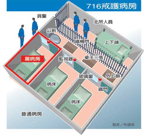 臺北縣立醫(yī)院板橋院區(qū)戒護病房位在七樓第十六間病房,編號“716”,屬于臺北看守所專用,即使無受刑人或在押被告就醫(yī),仍由看守所管理,醫(yī)護人員私下戲稱716房是“監(jiān)獄病房”。