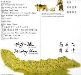 馬英九伉儷新年賀卡18日出爐,內頁挑選橫躺的臺灣古輿圖以及水牛耕種圖做為圖樣。(臺灣“中央社”圖)