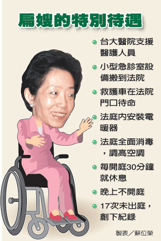 除了基本的醫療戒護,臺北地院擔心長時間開庭,虛弱的吳淑珍會撐不住,每開庭30分鐘就休庭10分鐘,庭訊預計3小時,而且晚上不開庭,甚至在律師進行答辯時,吳淑珍還可以到一旁的第八法庭稍作休息。這樣的高規格對吳淑珍,就是要讓審理過程更加順利。