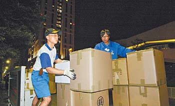 記者昨晚9時許根據爆料前往寶徠,發現一輛標明“康潔搬家公司”的17噸大貨車停靠距寶徠100米處,旁邊還有一輛1.75噸小貨車,約有6名搬家工人將一箱箱貨品搬上車,分析應是陳致中搬家。