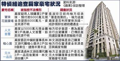 特偵組為追查扁家是否利用購買豪宅洗錢,除調(diào)查寶徠及脫手的一品苑外,還鎖定追查扁家的高雄人文首璽2戶豪宅,以及扁家是否委任“中鋼”前董事長林文淵低價代購北市“植心園”2戶豪宅。