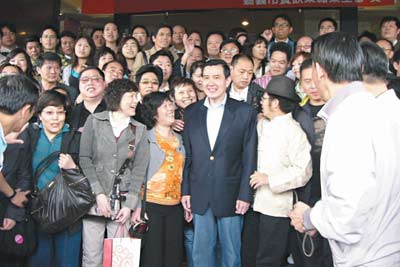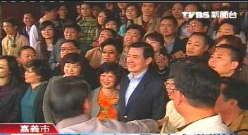 馬英九于前晚夜宿嘉義市中信飯店,1日一早在飯店前,巧遇100多名大陸旅客,都擠著要和他合影,馬英九索性主動走入大陸游客群中來個大合照。