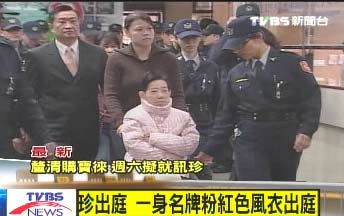 吳淑珍素顏穿著一身名牌粉紅色風(fēng)衣,和2年前出庭時(shí)穿的是同一款。手上沒有帶任何鉆戒與寶石。扁辦秘書江志銘表示,吳淑珍在出門前已經(jīng)先吃過藥了,身體應(yīng)該可以撐過2到3小時(shí)的庭訊;在警察戒備下,進(jìn)入第七法庭旁邊的候?qū)徥摇?