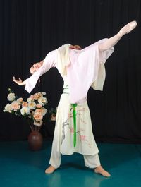 群舞部分增添了幻想角色,《花神》既群芳綻放,又具獨特個性美。張慈妤說:“芭蕾與民族舞的腳部質感不同,但有著共通性;上半身用現代肢體更能表現花的媚態。”《柳精》則隨風搖曳,呈現不斷連綿的身體律動,水袖則如柳枝來回輕擺。杜麗娘三次會見柳夢梅,從初始的渴望——僵尸跳的古典芭蕾,到回味激情——情感性的現代芭蕾,至擔憂告白——憂愛交雜動作加大,我們會看到古典杜麗娘如何藉芭蕾與現代,復古鑠今。