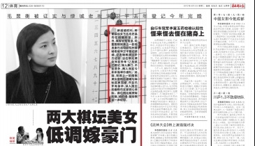 新結(jié)婚時代,即便是仙女下凡也還是向往婚姻殿堂。昨日,某專業(yè)報報道,中國圍棋雙姝之一的毛昱衡已與中超杭州綠城老板宋衛(wèi)平登記結(jié)婚,記者隨即通過多方證實,這位棋壇美女早在去年12月就已登記,嫁入豪門,不出意外,兩人將在今年年底舉辦婚禮。此前,雙姝之一的圍棋美女唐莉也被爆與神秘富豪完婚,并且已懷有身孕,深入簡出的唐莉已在家安心養(yǎng)胎。兩位棋壇最美嫁的嫁,婚的婚,留給棋迷一聲嘆息。