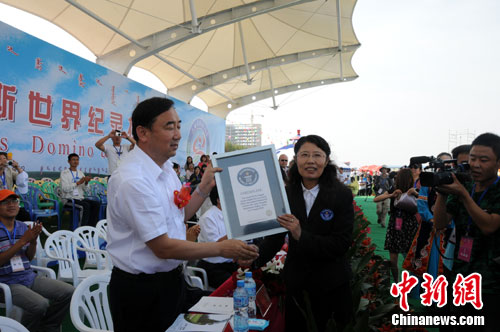 中新網鄂爾多斯8月12日電(記者 盧巖)一項沉寂十年之久的吉尼斯世界紀錄今天在鄂爾多斯被打破。作為首屆鄂爾多斯國際那達慕大會重要活動之一的“萬人多米諾”項目暨吉尼斯世界紀錄挑戰活動在東勝圓滿落幕,刷新了由新加坡在2000年創造的9234人的紀錄。