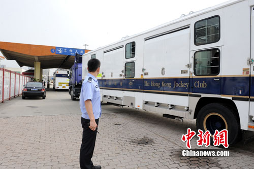 10日清早7時40分,香港賽馬會的兩輛粵港兩地牌貨車(車內運有18匹賽馬)和6輛隨行保障車由香港經皇崗口岸入境,皇崗邊檢站警戒隊按預案要求,派警車從橋頭將運馬車輛一行安全引帶至貨檢入境查驗場地停靠在指定的臨時候檢區(qū)域,并擔負警戒監(jiān)護工作。在檢驗檢疫部門進行消毒的同時,貨車檢查隊、小(客)車檢查隊的民警立即聯(lián)動,高效、快捷、優(yōu)質的為入境機動車司機、馬童及隨行人員共33人的證件辦理查驗手續(xù)。8時50分,運馬車輛及隨行人員離開皇崗口岸前往廣州亞運馬術場。