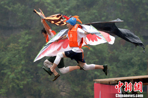 記者在現(xiàn)場看到,來自中國各地的6名鳥人跳水愛好者參加了今天的首跳儀式。水上拓展區(qū)周圍,放著20多副“鳥人”翅膀,有的像老鷹的翅膀,有的像大風(fēng)箏,有的做成汽車模樣,有的像仙女服裝,有的干脆用幾把普通的雨傘扎成,可謂千奇百怪,各具特色。6名鳥人愛好者依次走上5米高的跳臺,用各種姿勢往下跳。有的騰空躍起,再緩緩下落、有的來一個(gè)前空翻再落入水中、有的在空中連翻幾個(gè)筋斗直入水中、有的作仰睡狀背先落水,鳥人跳水的怪模樣引得眾多觀眾哈哈大笑。