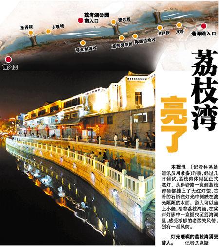 廣州日報11月3日報道 昨晚,經過幾日調試,荔枝灣休閑區正式亮燈,從泮塘路一直到荔枝灣涌都掛上了大紅燈籠,古樸的石橋在燈光中倒映在波光粼粼的水面,游人可以坐上小艇,沿著荔枝灣涌,在槳聲燈影中一直搖曳至荔灣湖里,感受濃郁的老西關風情,別有一番風韻。
