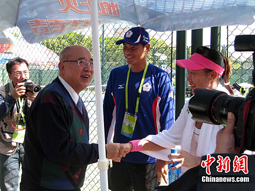 中新網(wǎng)廣州11月13日電 (記者 郭軍)13日上午,廣州亞運(yùn)會(huì)網(wǎng)球女子團(tuán)體賽第一輪中華臺(tái)北隊(duì)對(duì)越南隊(duì)的比賽在奧體網(wǎng)球中心四號(hào)場(chǎng)舉行。中國(guó)國(guó)民黨榮譽(yù)主席吳伯雄來(lái)到賽場(chǎng)外為寶島選手加油鼓勁。