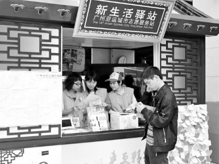 昨天下午當班的黃洪丹,是廣東交通職業學院的大二學生,也是同行8人的班長。她為記者一一介紹了站內各種方便設施,告訴記者今天短短幾個小時,她們已經接待了100多位前來咨詢的朋友,“就是剛才,我們剛給一大幫外國朋友指了去亞運村的路呢。”