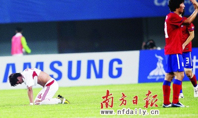 韓國隊的三粒入球完成得相當輕松。上半場還未過半,韓國隊左路一記長傳打穿中國隊整條防線,當曹永哲橫傳到門前時,破門的金正友竟然無人防守。下半場開始不久,先有樸周永任意球彈地入網,后是曹永哲的再入空門,當韓國隊建立起3球的領先優勢后,無望的球迷們選擇了用提前退場的方式來表達自己的不滿。當然,也有人留下來“喝彩”,但他們高喊著的是“韓國隊,4比0!”