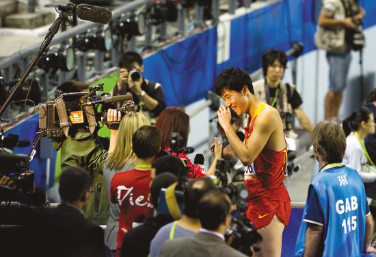 16時45分,奧林匹克中心文字記者工作間,一角的空地上站著幾位拿著手機連線的記者,“劉翔”之聲不絕于耳。