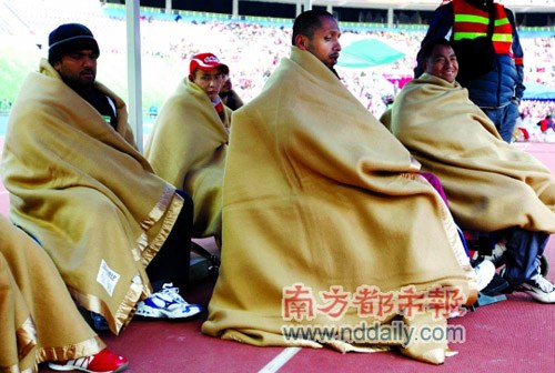 寒風(fēng)清冽,低溫襲來(lái),面對(duì)廣州忽如而至的大幅降溫,參加廣州亞殘會(huì)的運(yùn)動(dòng)員們?cè)诒荣愰g隙各出妙招保暖,有的裹上毛毯,有的延長(zhǎng)熱身,有的自制暖水袋……